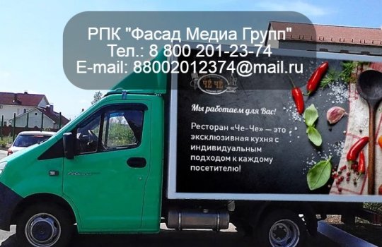 РПК «Фасад Медиа Групп» разместило рекламу на мобильном билборде для ресторана современной кухни. Наше агентство разработало дизайн-проект рекламы. Печать и монтажные работы осуществили также наши специалисты. В рекламной кампании задействовано 10 машин