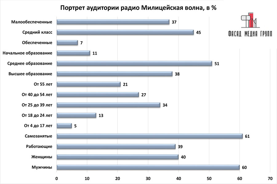 Реклама на радио «Милицейская волна» в Златоусте ориентирована на самый широкий круг людей. Вместе с тем, радиостанция транслирует разный контент, ориентированный на различную публику. Следовательно, рекламодателю необходимо знать целевую аудиторию рекламируемого товара или услуги, чтобы разместить рекламу на радио «Милицейская волна» с максимальным эффектом. В решении данной задачи вам помогут специалисты «Фасад Медиа Групп».