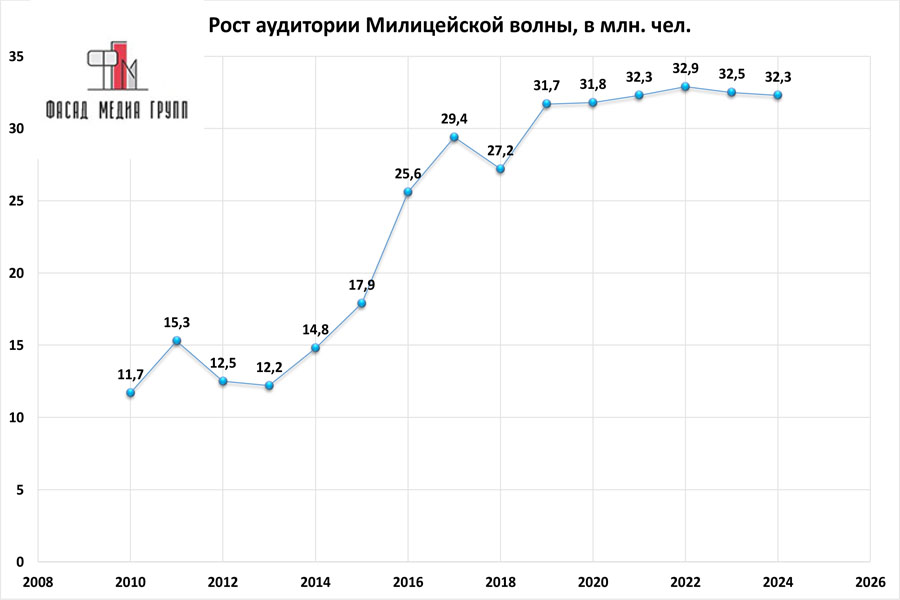 «Милицейская волна» – это популярная радиостанция, сбалансированный эфир которой привлекает большую аудиторию радиослушателей. Каждый год радиостанция демонстрирует высокие показатели по охвату аудитории.