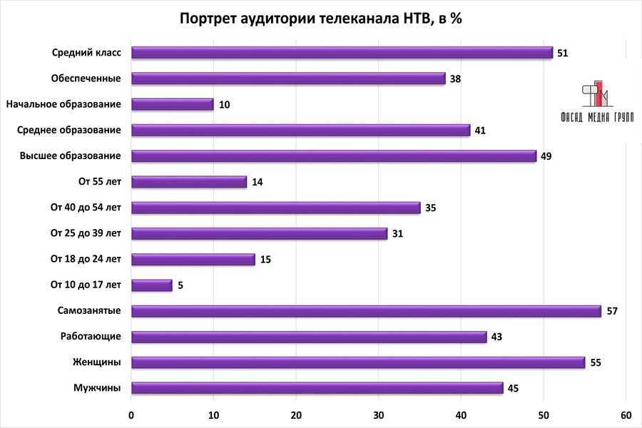Благодаря качественному, сбалансированному контенту аудитория «НТВ» многочисленна и разнообразна.