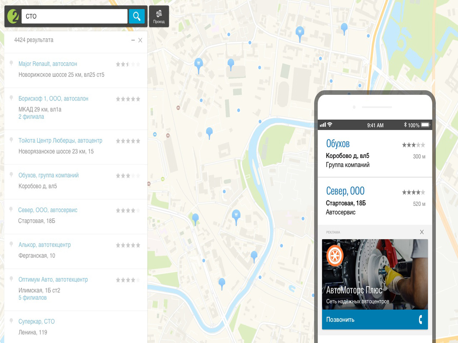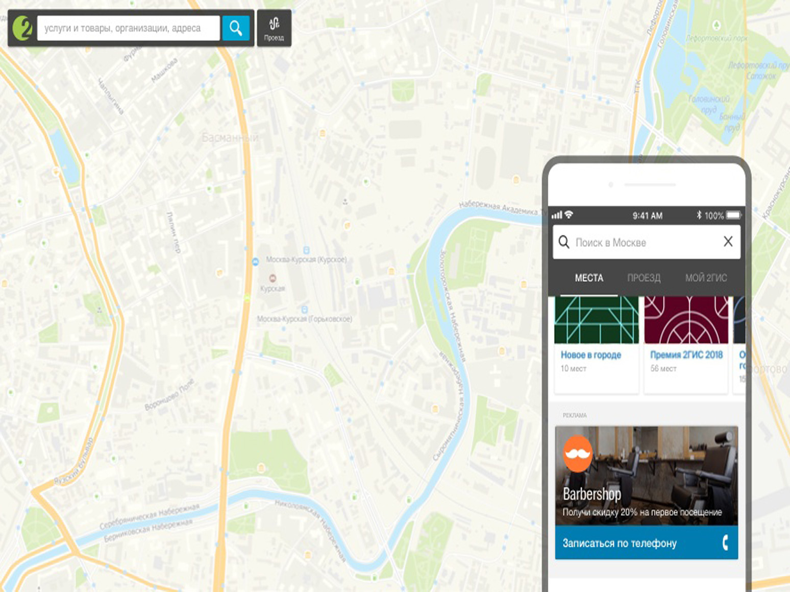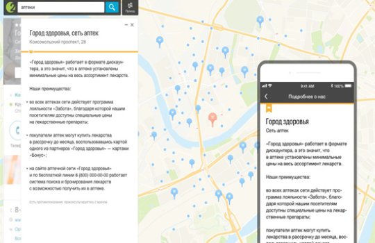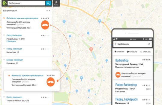 В 2ГИС (Двагис, ДубльГис) доступна геореклама – контекстная и медийная реклама, которую видит пользователь с учетом географии его интересов или текущего местоположения.