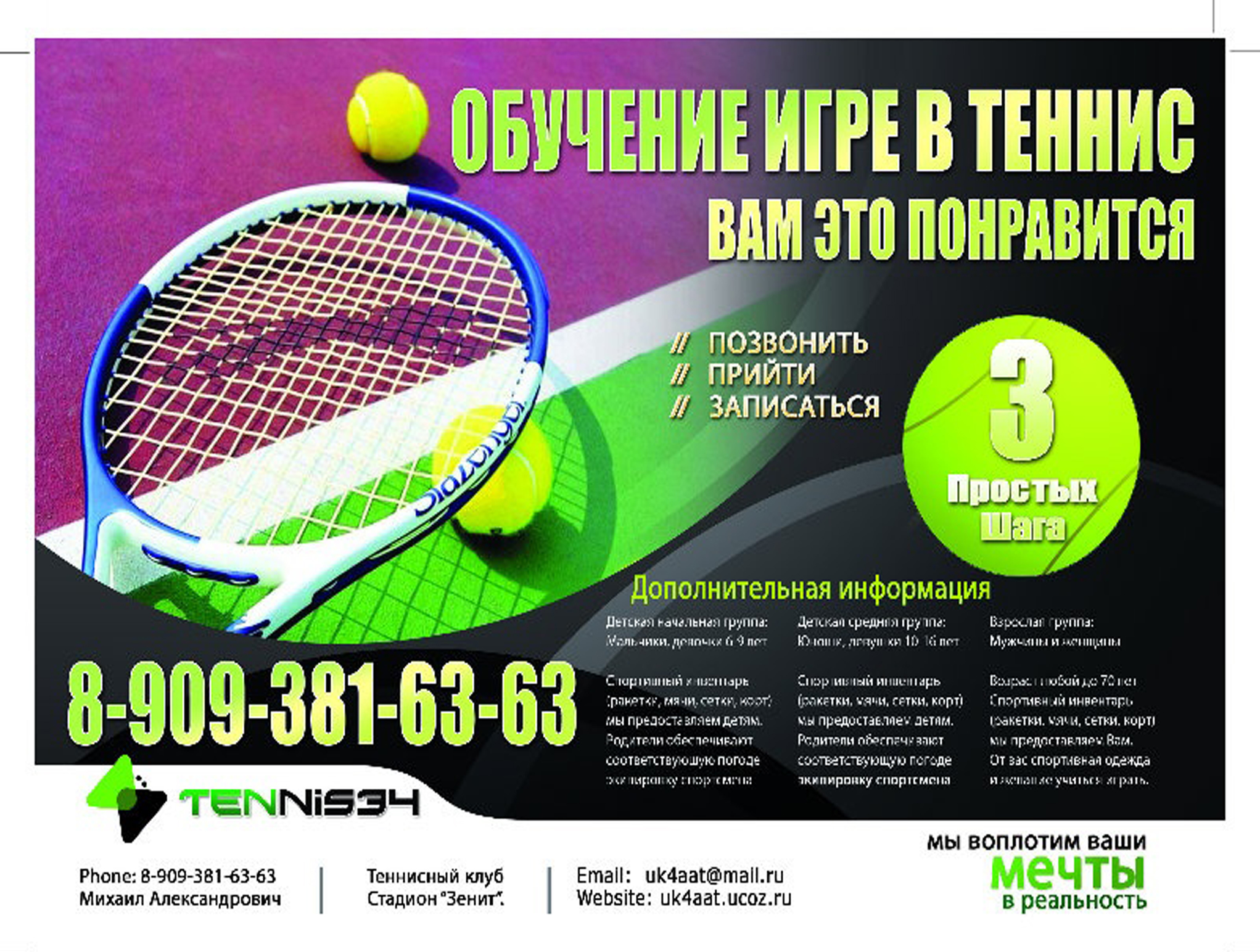 Помимо баннеров для размещения рекламы в теннисных клубах мы печатаем и плакаты, не такие большие, но эффективные для привлечения внимания потенциальных клиентов и заказчиков.